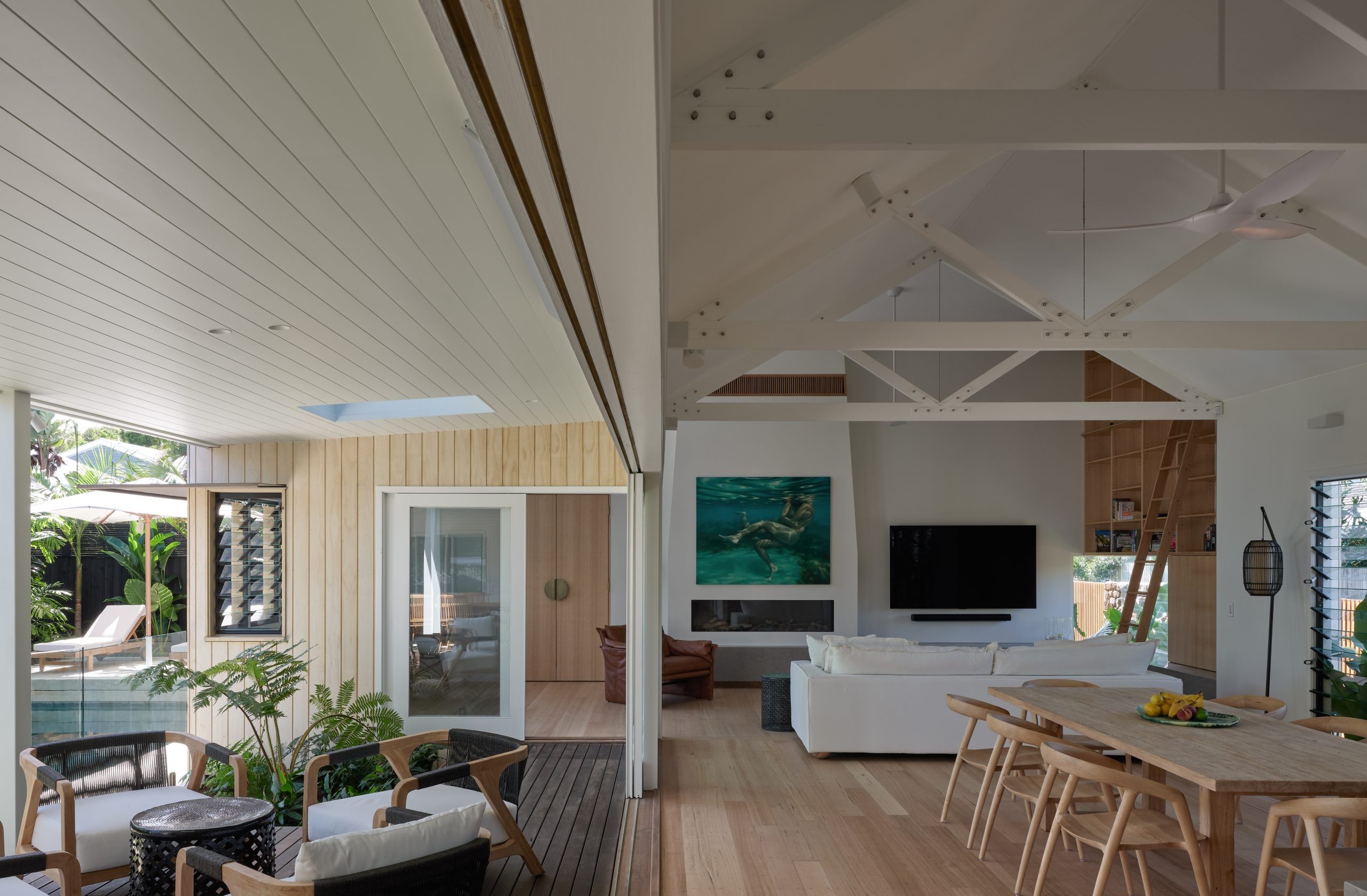 Throughout the home, the consistent use of timber products helps shape a cohesive atmosphere across both interiors and exteriors. The natural finishes enhance the coastal character, support seamless transitions between spaces and allow the home to sit comfortably within its lush setting.