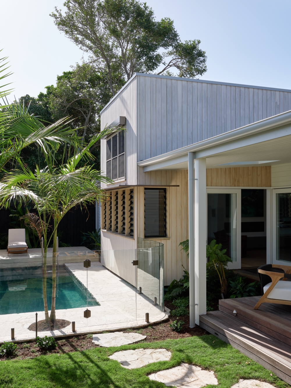A defining element of the site planning is the creation of a tropical swimming pool oasis within the main yard. This central outdoor space was designed to feel immersive and resort-like, yet it doesn’t overwhelm the block or disrupt the openness of the garden. Instead, it enhances the way the home engages with its surroundings, offering multiple zones for entertaining, relaxing and enjoying the subtropical climate. From inside, views extend across greenery and water, reinforcing a constant dialogue between built form and landscape.