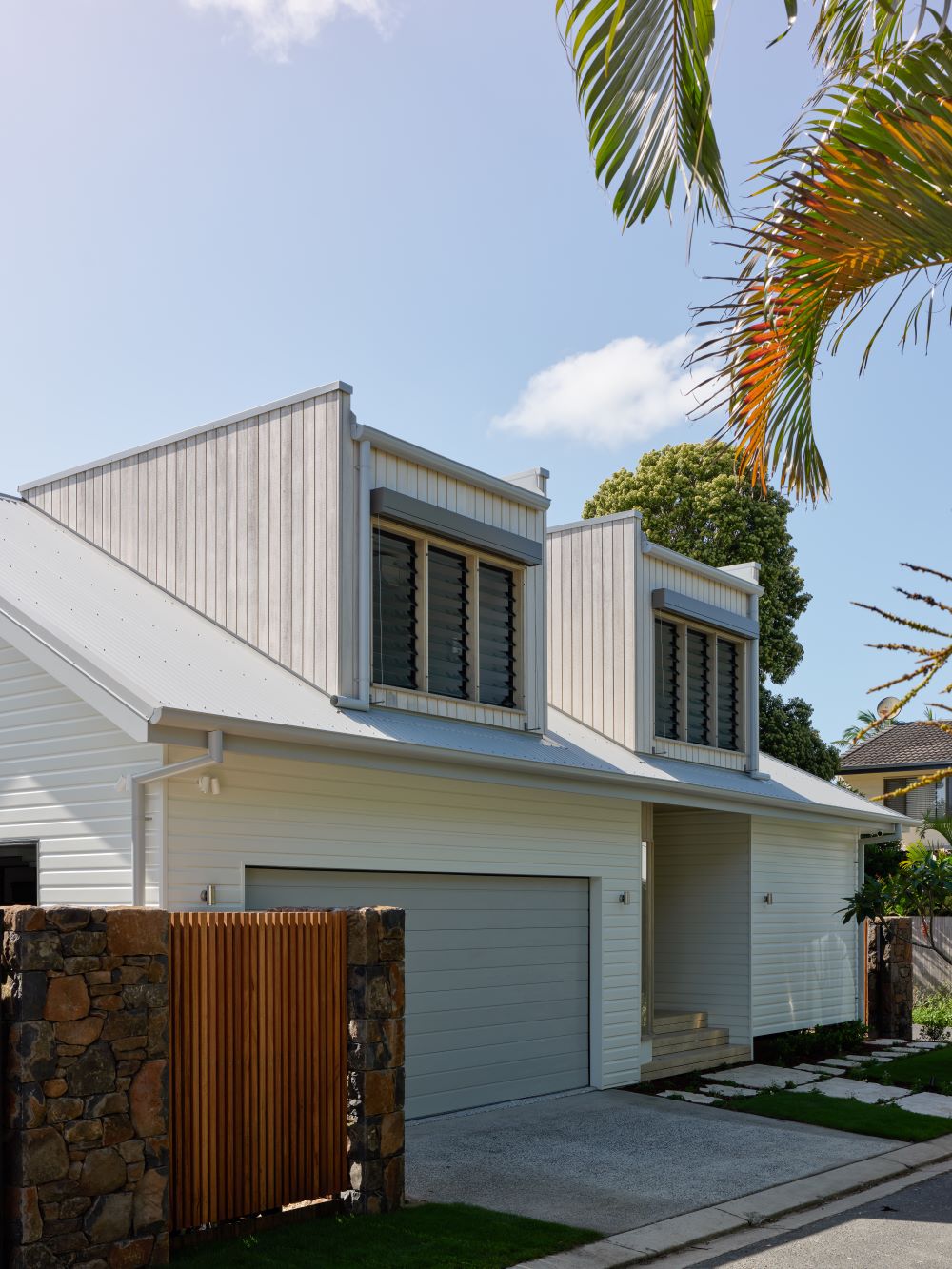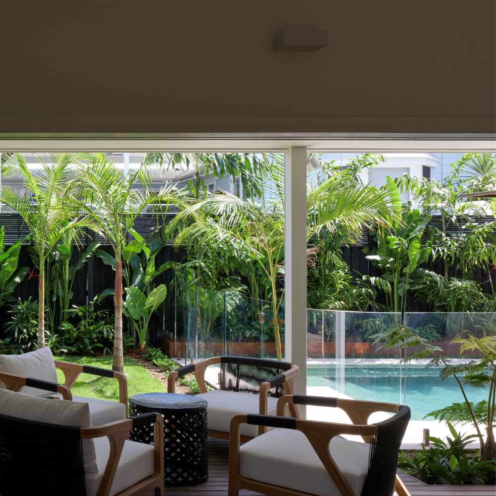 A defining element of the site planning is the creation of a tropical swimming pool oasis within the main yard. This central outdoor space was designed to feel immersive and resort-like, yet it doesn’t overwhelm the block or disrupt the openness of the garden. Instead, it enhances the way the home engages with its surroundings, offering multiple zones for entertaining, relaxing and enjoying the subtropical climate. From inside, views extend across greenery and water, reinforcing a constant dialogue between built form and landscape.