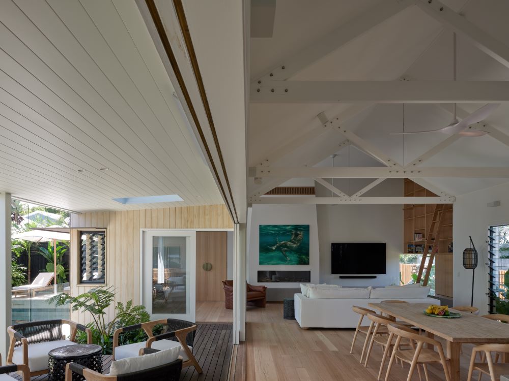 Material selection plays a major role in shaping the home’s atmosphere, with a strong focus on natural, high-performance timber products supplied through Big River Group’s Burleigh Heads branch. Contemporary box forms are expressed through vertical shiplap cladding in Accoya timber, a durability class 1 sustainable wood chosen for its stability and longevity in coastal conditions. Accoya was also used for exterior decking, ensuring a cohesive finish across outdoor living zones while providing a surface designed to withstand the elements and heavy family use.