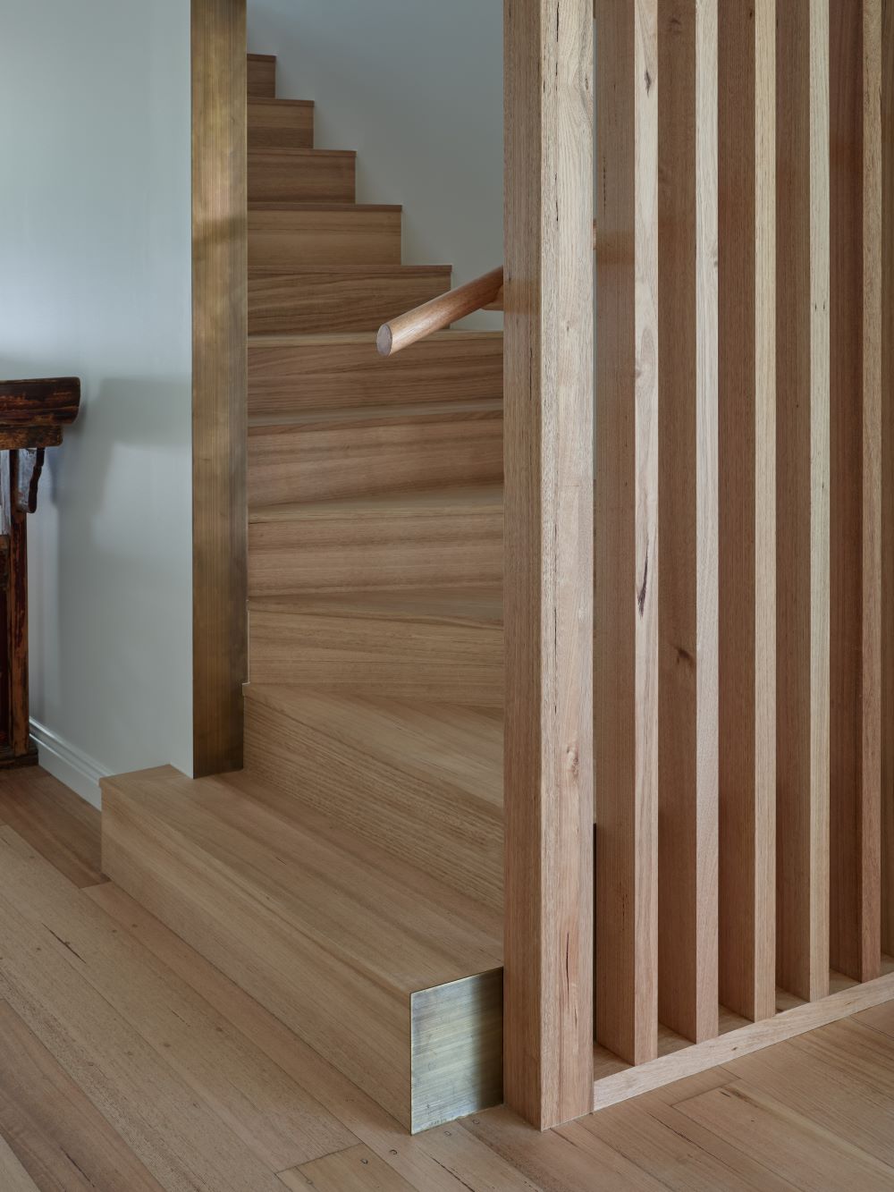 Inside, Tasmanian Oak tongue-and-groove solid flooring, sourced through Big River Group’s national supply network, runs throughout the key living areas, complemented by matching timber mouldings and internal doors. By working with trusted wholesale partners, Big River was able to support the project with high-quality solid oak flooring that aligned with the home’s architectural intent.